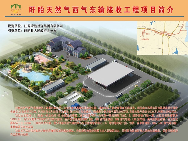 西氣東輸盱眙接收工程是盱眙縣十二五規(guī)劃重要基礎(chǔ)設(shè)施建設(shè)工程,是盱眙縣人民政府重點招商項目。項目由江蘇榮浩投資集團有限公司投資建設(shè),總投資約2億元,于2012年9月28日開工建設(shè),預計2013年底建成。建成后日最大輸氣量達200萬方,年最大輸氣量達6億立方,利稅達2000萬元。